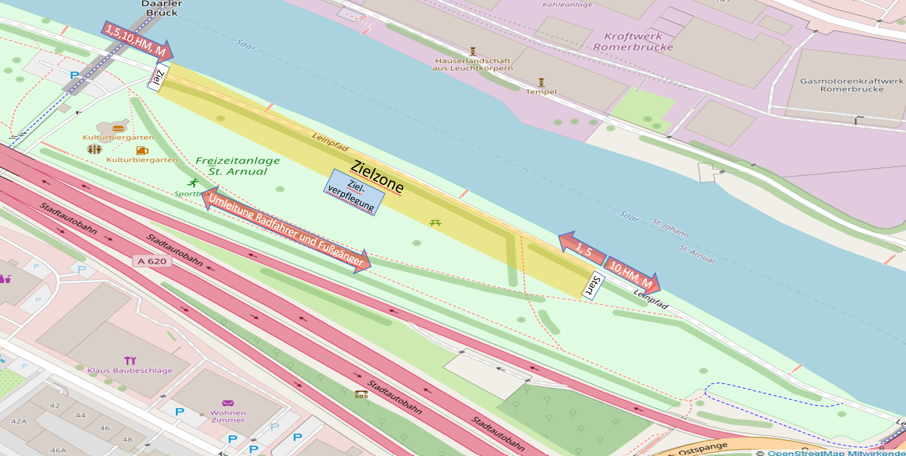 Verpflegung: nach 5 km in Höhe Staatstheater, 8,5 km (Malstatter Brücke), 12 und 14 km (Schleuse), 17,5 km (Malstatter Brücke) und im Ziel