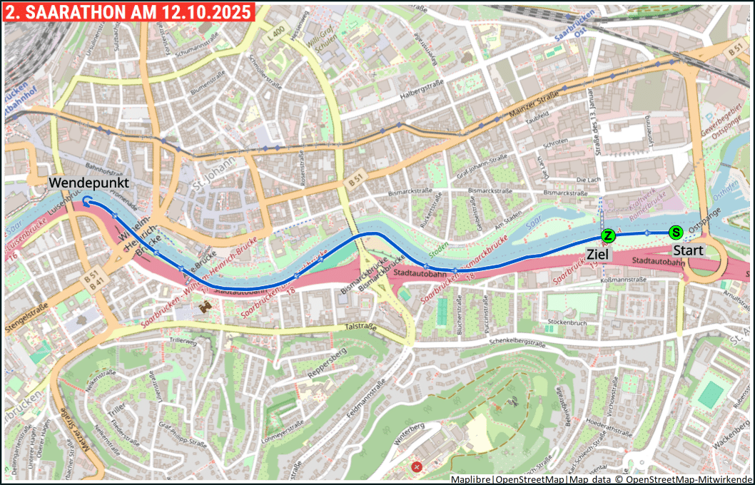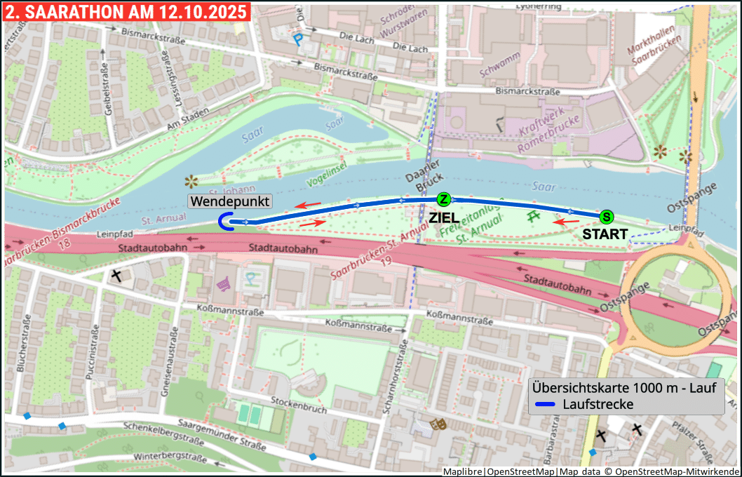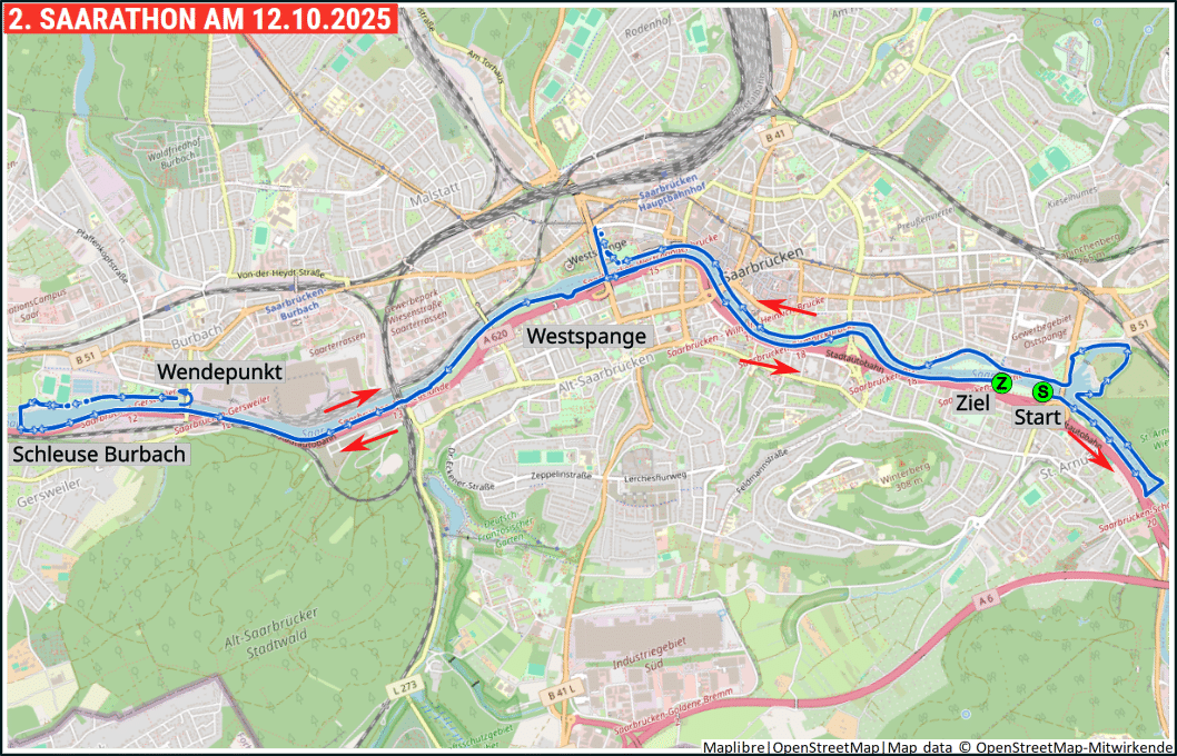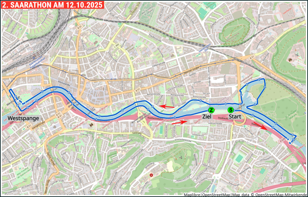 Der Start erfolgt Saar-abwärts. Über die St.Arnualer Brücke (auch tote oder Soda-Brücke genannt) geht es auf die rechte Saarseite und dort um den alten Hafen herum unter Ostspange und Daarler Brücke an den Staden. Am Staatstheater vorbei führt der Weg unter der Berliner Promenade und Kongresshalle durch den Bürgerpark zur Westspangenbrücke. Dort wechseln wir wieder auf die linke Saarseite und laufen über den Leinpfad Saar-aufwärts ins Ziel.