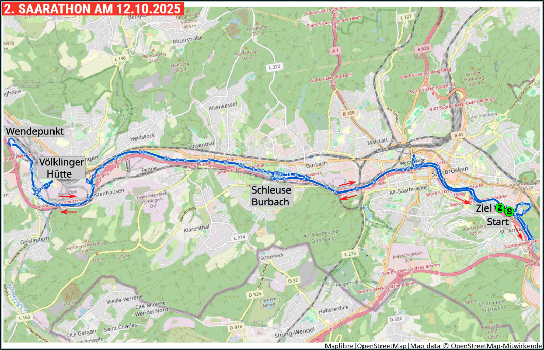 Die Marathon-Strecke folgt der Halbmarathon-Strecke bis zu ihrem Wendepunkt an der Gersweiler Brücke. Zurück an der Schleuse trennen wir uns von den Halbmarathonis und laufen weiter Richtung Völklingen. Über die Karolinger Brücke in Völklingen kommen wir zurück auf die linke Saarseite, von wo wir einen schönen Blick auf die aktive Saarstahl-Hütte haben. Über die Wehrdener Brücke geht es auf einer kleinen Schleife durch das Weltkulterbe Völklinger Hütte und danach weiter auf der linken Saarseite noch ca 1,5 km bis zum Wendepunkt bei 25,5 km. Von dort aus geht es zurück über den Leinpfad auf der linken Saarseite, wieder mit Blick auf Walzwerk, Weltkulturerbe, und Stahlwerk Völklingen zur Karolinger Brücke. Wie auf dem Hinweg wird dort die Saarseite gewechselt und an der Schleuse noch einmal. Mit Blick auf das Stahlwerk Burbach geht es dann entlang der Kleingartenanlage zur Westspange und unter den Brücken von Saarbrücken hindurch beschwingt ins Ziel.